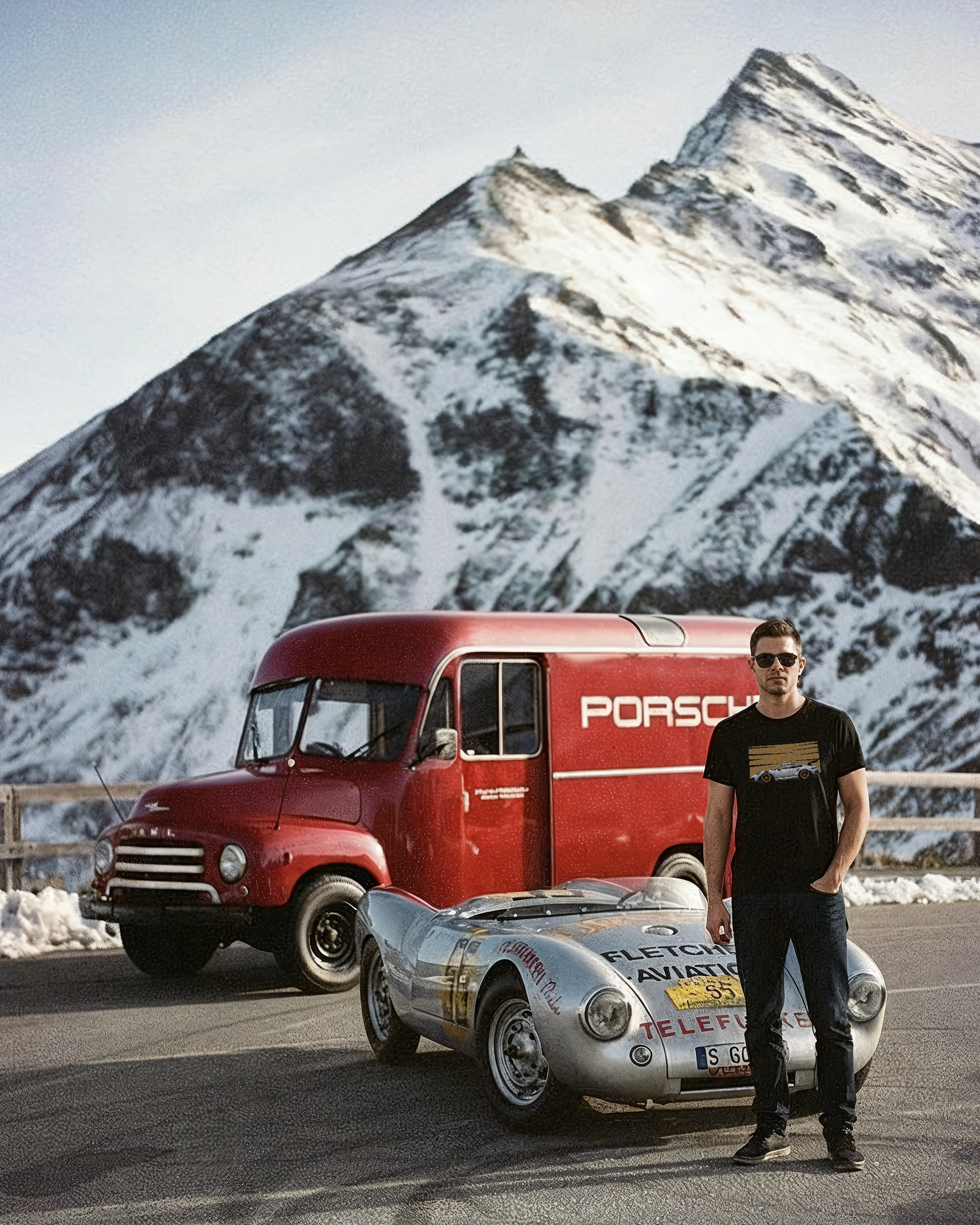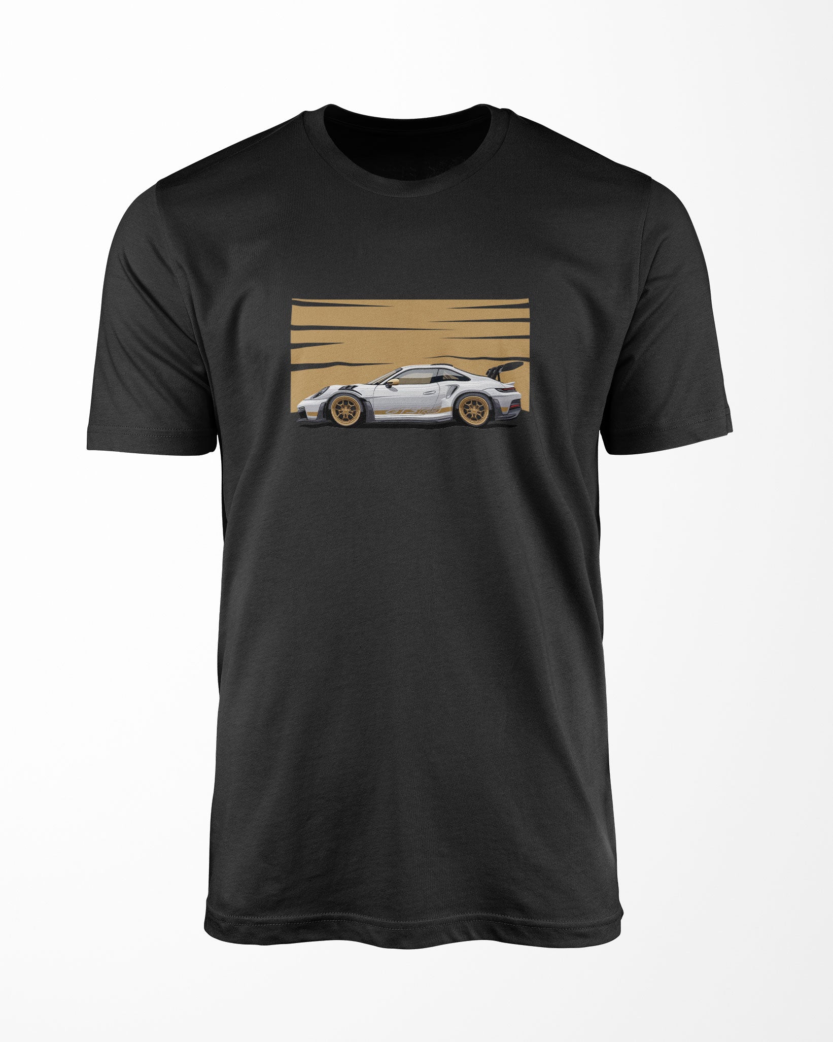 The design pays homage to the legendary Porsche 911 GT3 RS — a car born in the crucible of motorsport and refined on the knife’s edge of performance. Dressed in striking gold details and track-ready stance, this silhouette captures the raw essence of German engineering at full throttle. Every contour of the print whispers Nürburgring, and every golden highlight nods to Porsche's relentless pursuit of perfection. This isn’t just a shirt — it’s a celebration of horsepower, heritage, and the holy grail of handling.