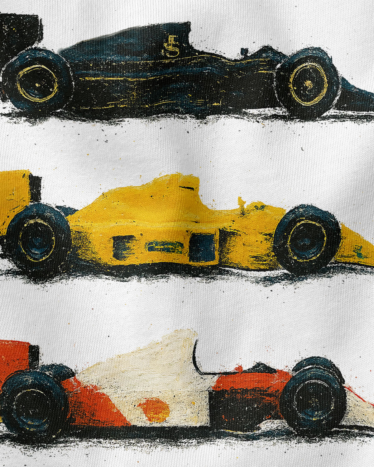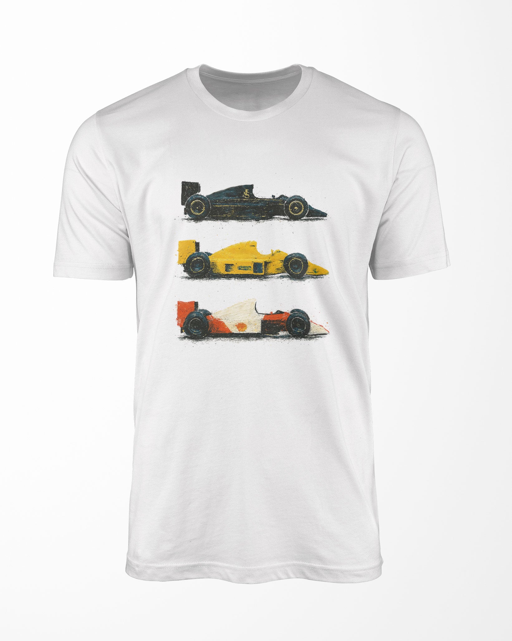Three cars. Three machines that defined eras in Formula 1. The black and gold from the turbo age, the bold yellow that ruled the '90s, and the red and white that became the blueprint for perfection on track. Timeless icons of speed, side by side in a print full of texture and character.