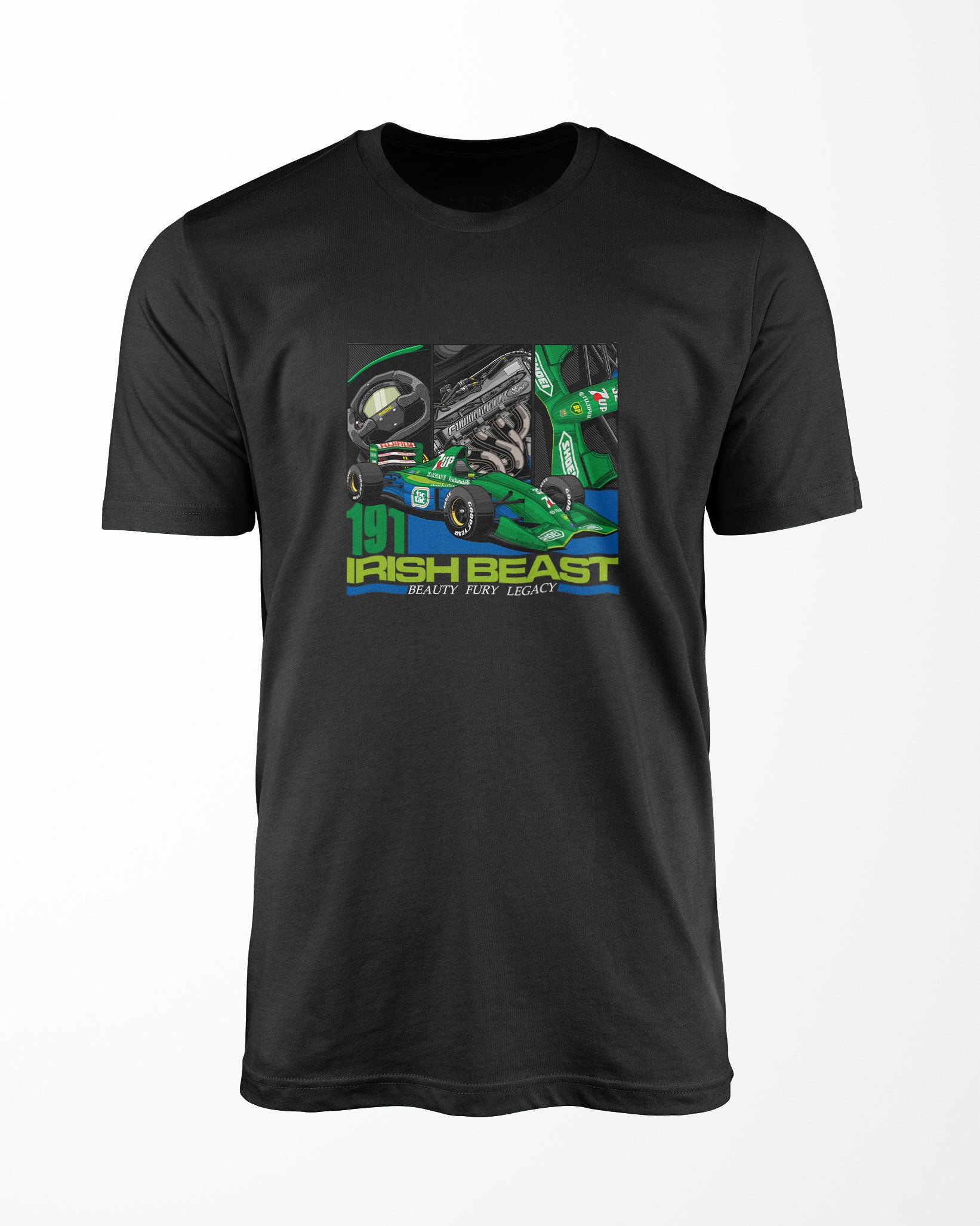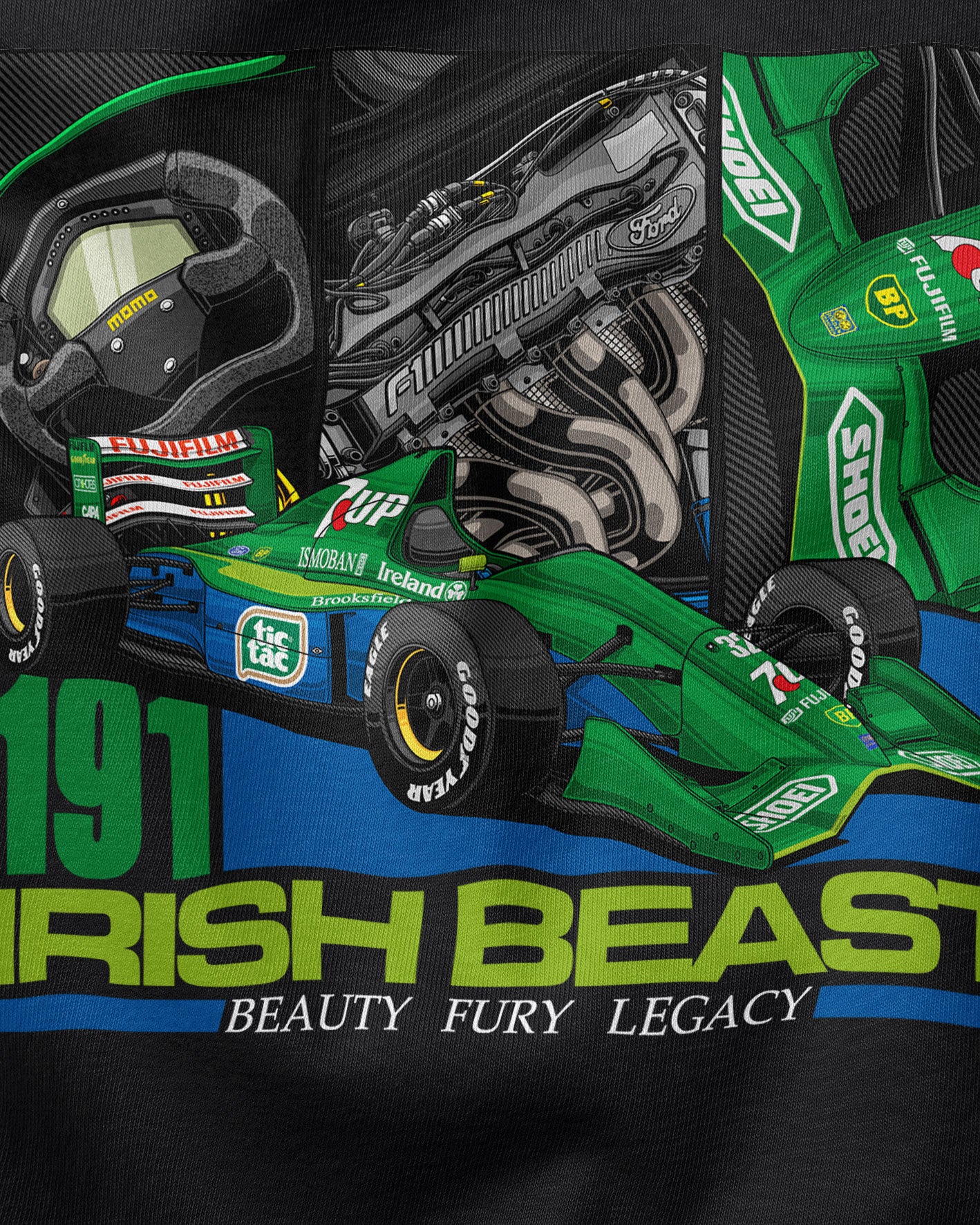 The t-shirt pays tribute to the iconic "Irish Beast," a track monster that made history with the Jordan 191 car. Founded by Eddie Jordan in 1991, the Irish team quickly stood out with its impressive debut. In its very first year, the Jordan 191, with its distinctive green livery, earned respect in the paddock for its combination of innovative design and solid performance. This car not only launched the careers of legends like Michael Schumacher but also symbolized the bold spirit and passion for speed.