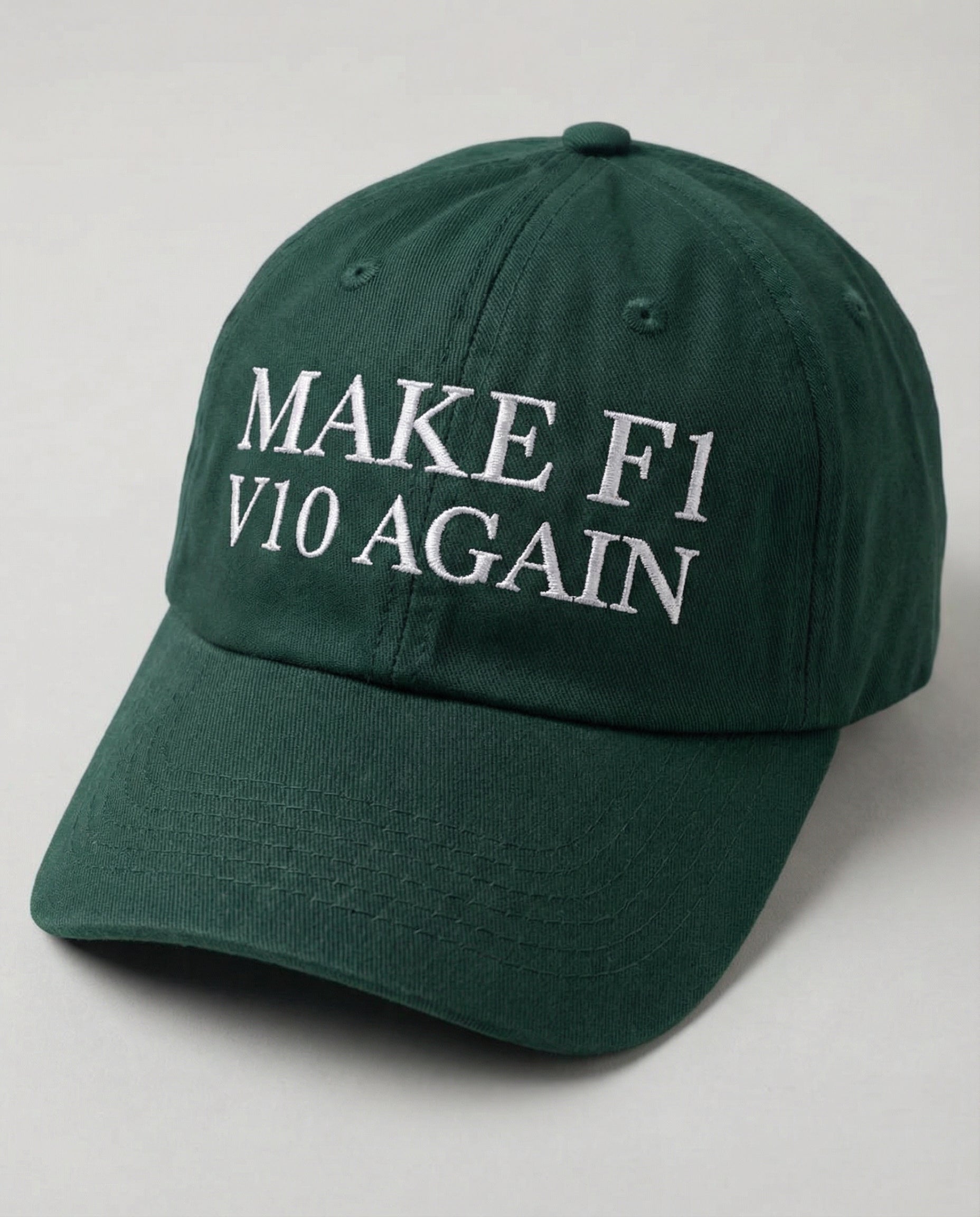 The Make F1 V10 Again cap is a tribute to the golden era of Formula 1 — when engines screamed and racing felt raw. Featuring bold white embroidery on deep green cotton, it delivers a clean, confident statement.