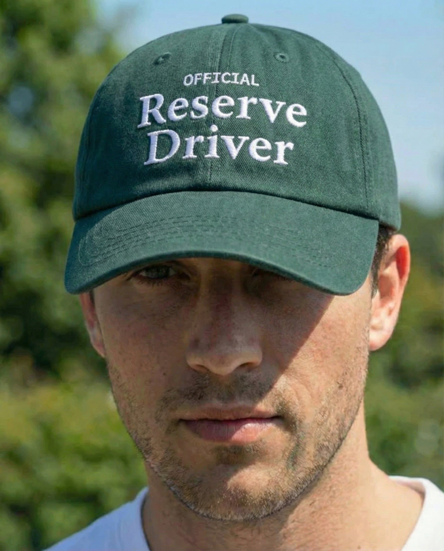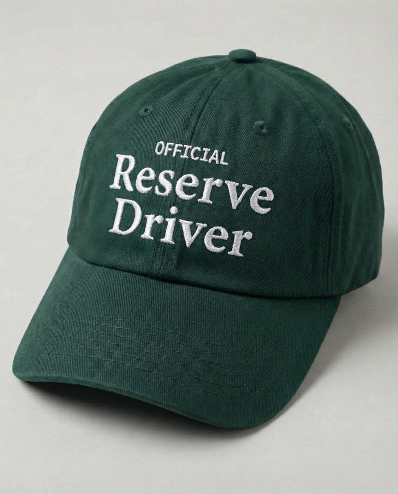 The Official Reserve Driver cap brings subtle motorsport humor to everyday style. Featuring high-quality white embroidery on deep green cotton, it delivers a clean, confident look with a touch of irony.